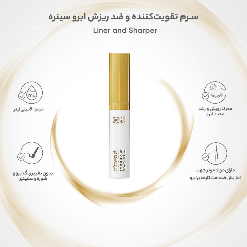 احتمالا برای شما هم پیش آمده که با خالی شدن و ریختن ابروهایتان به فکر ترمیم و درمان آن آفتاده باشید؛ صرف نظر از یافتن علت مشکل که گاهی نیاز به درمانهای تخصصی دارد در اکثر مواقع با استفاده از محصولات مراقبتی میتوان ابروهایی پرپشت داشت. سرم تقویت کننده و ضدریزش ابرو سینره دارای پپتیدهای موثری است که سبب افزایش استحکام موها در محل رویش، طولانی شدن فاز رشد موها و تحریک رویش مجدد آنها میشود. وجود مواد مغذی از جمله ویتامینها و آمینو اسیدهای حاوی گوگرد باعث تقویت ابروها و جلوگیری از ریزش آنها شده و باعث تحریک گردش خون در محل و اکسیژن رسانی بهتر به ریشه ابروها می گردد. این سرم رنگ ابروها را تغییر نمیدهد و هیچگونه شوره یا سفیدی از خود به جای نمی گذارد و برای استفادهی آقایان هم مناسب است. همراه با سرم ضد ریزش یک اپلیکاتور خاص عرضه شده است که مصرف آن را راحتتر میسازد. برای رسیدن به نتیجهی مطلوب میبایست روزانه دوبار بر روی ریشهی ابروهای تمیز ماساژ داده شود تا کاملا جذب پوست شود.