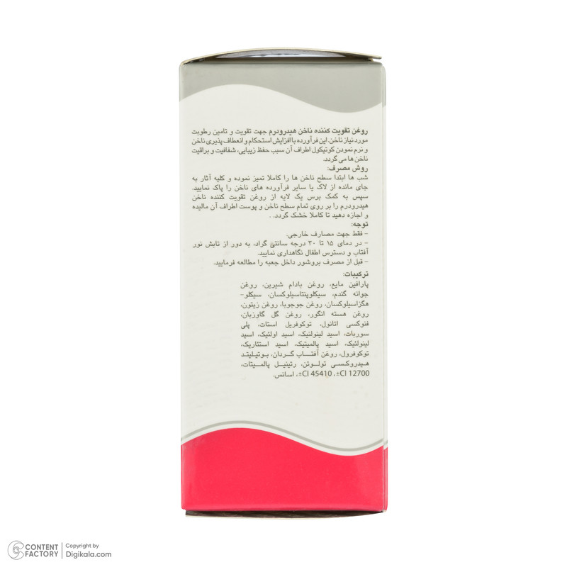 داشتن ناخنهایی زیبا ملزم به رعایت یک سری اصول است؛ همانگونه که پوست و مو احتیاج به مراقبت دارند ناخنها نیز از این امر مستثنی نیستند. روغن تقویت کننده ناخن هیدرودرم «Hydroderm» با توجه به نیاز افراد در اختیار مصرفکنندگان قرار داده که کاملا طبیعی تولید شده و اثر نرم کنندهگی و مرطوب کنندهگی در سطح ناخن را حفظ میکند. لابراتور پارس حیان محصولات خود را با برند هیدرودرم به بازار معرفی کرده است که یکی از بزرگترین تولیدکنندگان محصولات آرایشی و بهداشتی در سطح خاورمیانه بوده و با برندهای هم رده خود رقابت چشمگیری دارد. این محصول حاوی کمپلکس تقویت کننده و مرطوب کننده روغن های بادام شیرین، گل گاوزبان، جوجوبا و دانه انگور و ویتامینهای E و A را بوده که اثرات مفیدی را روی ناخن اعمال میکند. وجود این روغنها برای ناخن مفید است وباعث میشود ناخنهایی زیبا را در معرض دید همگان قرار داد. روغن بادام شیرین علاوه بر تقویت کنندگی از ترک خوردن و شکستن ناخن جلوگیری کرده و روغن دانه انگور با خواص آنتی اکسیدان مانع پیری زود رس ناخن و پوست میشود. شاید خیلی از ما با بیماری قارچی روبرو شده باشیم اما این محصول با وجود روغن جوجوبا از وجود قارچها جلوگیری میکند. وجود مؤثر روغن گل گاو زبان در سرعت بازسازی سلولهای جدید کمک کرده و همچنین روغن بابونه نیز به نرم کردن پوست اطراف ناخن کمک میکند. وجود ویتامینهای موجود در این محصول از التهابهای پوستی جلوگیری کرده و پوست شما را در برابر اشعهی ماورای بنفش حفظ میکند. این محصول با عنوان تقویتکننده ناخن با حجم 8 میلیمتر برای افرادی که ناخنهایشان به مراقبت احتیاج دارد مناسب است.
