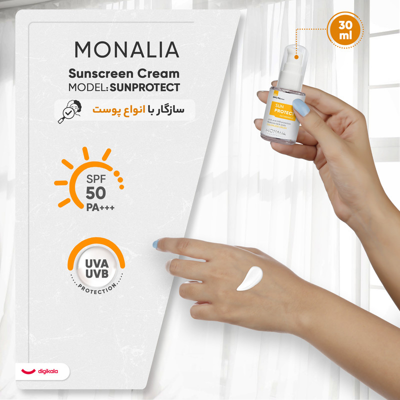 کرم ضد آفتاب مونالیا با دارا بودن SPF 50 و PA+++ یکی از قویترین ضد آفتابهای موجود محسوب میشود. این کرم قادر است از پوست شما در برابر هر دو نوع اشعه UVA و UVB محافظت کند. اشعه UVA باعث پیری زودرس و چین و چروک میشود، در حالی که اشعه UVB عامل اصلی آفتابسوختگی است. این کرم با ایجاد یک سد محافظتی قوی، از پوست در برابر هر دو نوع اشعه جلوگیری کرده و مانع از آسیبهای جدی ناشی از نور خورشید میشود.