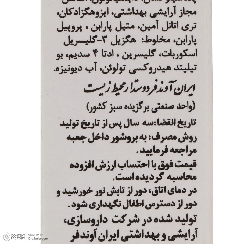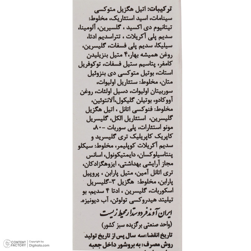 عصارههای موجود : آلوورا، روغن جوانه گندم، روغن آووکادو، عصاره برگ زیتون