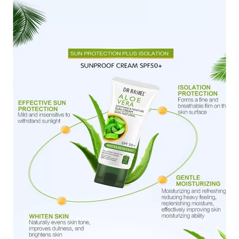 کرم ضد آفتاب بدون رنگ دکتر راشل SPF 50 مدل Aloevera مناسب برای انواع پوست می باشد . از ویژگیهای ضدآفتاب می توان به ضد آب بودن، محافظت کننده در برابر اشعه UVA، محافظت کننده در برابر اشعه UVB اشاره کرد.