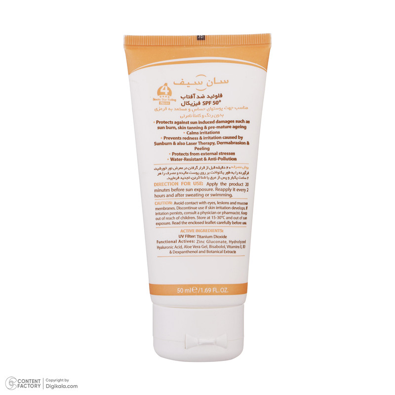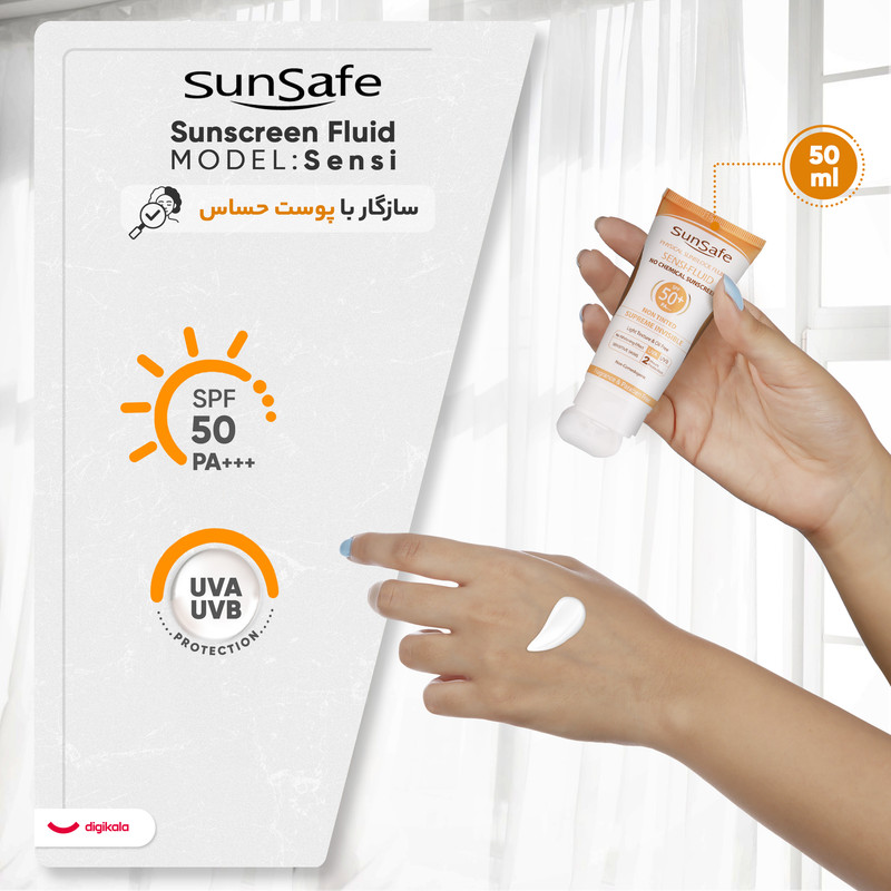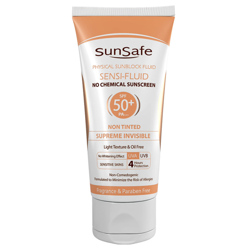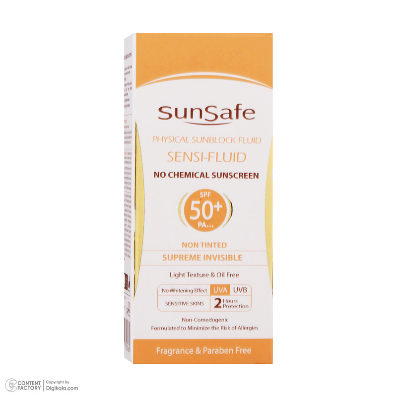 تولید ضد آفتاب سنسی فلوئید +SPF 50 سان سیف، عصر جدیدی در حفاظت پوست در برابر در درماتولوژی به شمار می رود. این ضد آفتاب فلوئید حفاظت وسیعی در برابر اشعه های UVA1 UVA2 و UVB ایجاد می کند که به واسطه میکروتیتانیوم دی اکسید است که یک سپر دفاعی برای پیشگیری اشعه های خورشید ایجاد می کند. ضد آفتاب سنسی فلوئید، حفاظت وسیعی در برابر اشعه های UVA و UVB ایجاد می نماید. کمپلکس ویتامین E+B3 و چای سبز، از آسیب DNA پوست در اثر خورشید جلوگیری می کند. این محصول بر پایه سیستم نوین Water Gel فرموله شده است و در نتیجه فاقد امولسیفایر است.